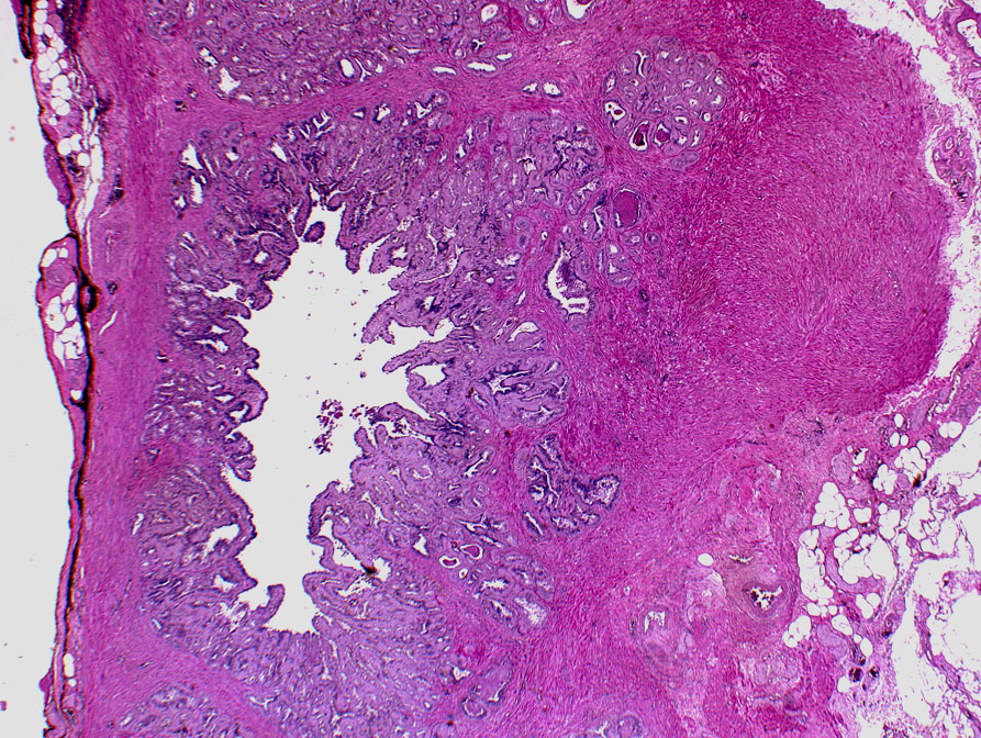 Cross-sections of the seminal vesicles are free of tumor, but show dense subepithelial deposits of an amorphous hyaline material. Congo red stain shows apple green birefringence. There is prominent amyloid deposition within the stroma of the seminal vesicles and vasa deferentia, with no vascular amyloid deposition identified. |